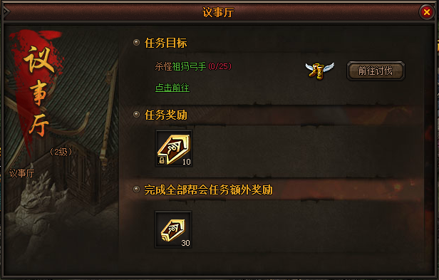 议事厅:接取帮会任务的场所,完成帮会任务获得帮贡奖励;
