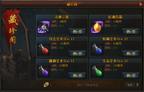 藏珍阁:帮会商店,根据藏珍阁的等级可以消耗帮贡购买特有的进阶材料、装备与属性药品;