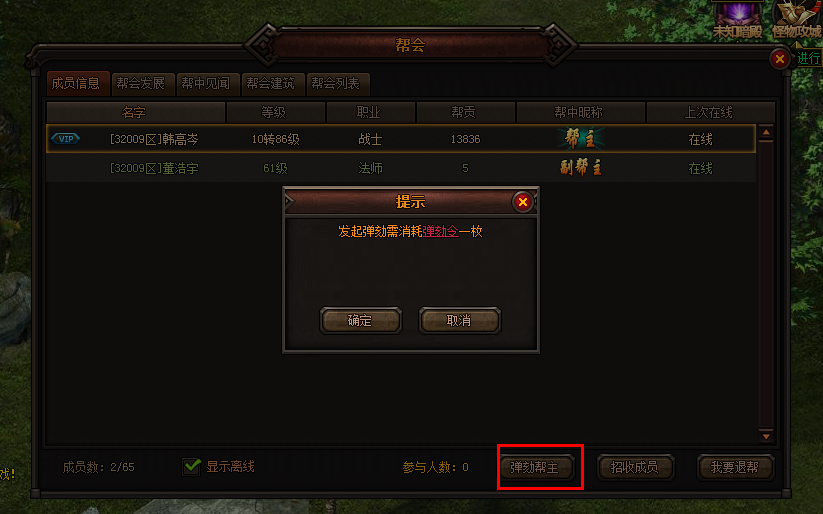 帮主3天未上线,帮会成员可以使用“弹劾令”对帮主发起弹劾: