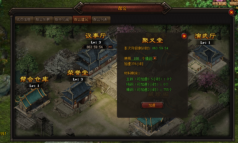 帮会成员可使用材料对帮会建筑的升级进行加速,加速材料可通过击杀帮会BOSS获得