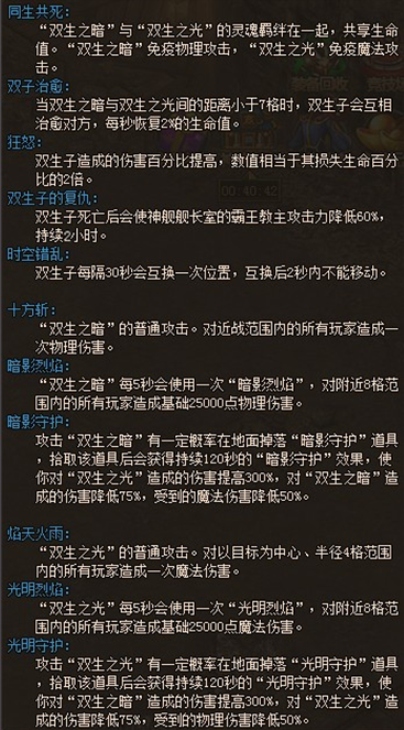 3. 神舰3层“船舱”新增高级BOSS:“双生子”。“双生子”详细技能见游戏内高级BOSS面板怪物图片TIPS。“双生子死亡后”霸王教主的攻击力会在2小时内降低60%。
