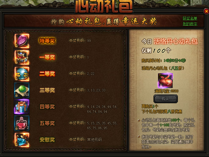 心动礼包每天仅放出100个,每个礼包中还有一个1-100的号码,购买礼包后,号码会显示在我的号码中。