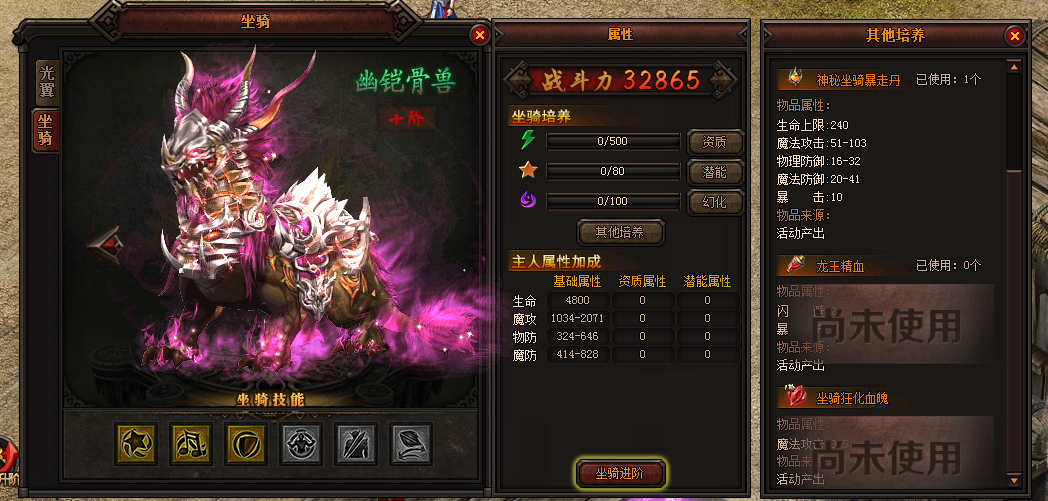 达到7阶即可开启潜能,每使用1个潜能丹即可增加0.5%资质属性,等阶越高使用上限越高;