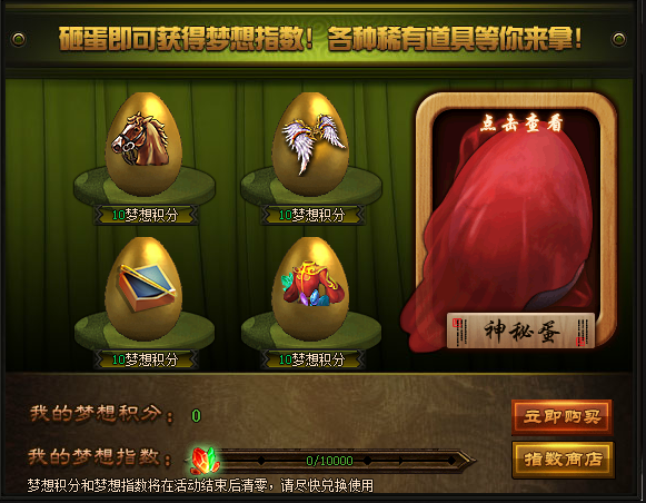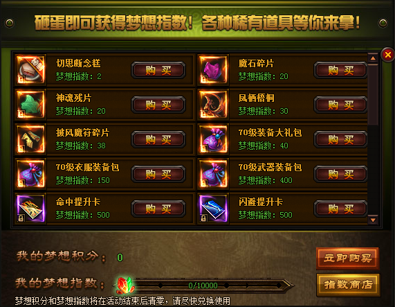 »î¶¯ÄÚÈÝ£º»î¶¯ÆÚ¼ä£¬Í¨¹ý³äÖµ1RMB»ò100Ôª±¦¹ºÂò»ñµÃ1ÃÎÏë»ý·Ö£¬Ê¹ÓÃÃÎÏë»ý·ÖÔÒµ°¿ÉÒÔ»ñµÃÃÎÏëÖ¸Êý£¬ÃÎÏëÖ¸Êý¿ÉÒÔÔÚÖ¸ÊýÉ̵깺ÂòÉÌÆ·¡£ÉñÃØµ°¼°Ö¸ÊýÉ̵ê¾ù¼ÓÈëÁ˲¿·Öħ¾ýÌ××°²¿¼þŶ~£¡