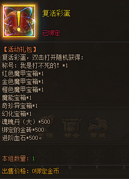 活动内容:活动期间内,每充值10000元宝可领取1次复活彩蛋。
