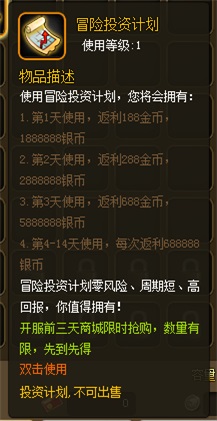 是否对冒险契约里的天使翅膀垂涎欲滴呢?别担心,在新服开启后,只要您充值任意金额,就可以获得价值6888金币的首充礼包一个,天使之羽就在礼包中等着您哦!另外还有直接使用就能升一级的“升级卡”哦!