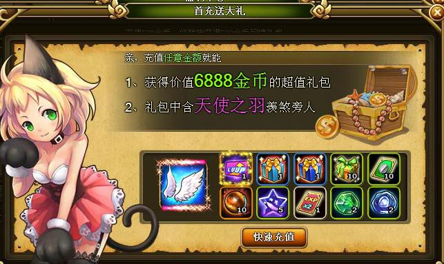 首充礼包内容(价值6888金币):天使之羽*1,升级卡*1,银币(10W)*10,极品星灵丹*10,1级攻击宝石*10,史莱姆T恤礼包*1(7天),棒棒糖嘴礼包*1(7天),成长之石*2,潜能之石*2,双倍经验卡*1,星羽*5升级卡:每个账号一辈子只能用一次,50级-59级期间能够使用,使用后可直接升一级哦!
