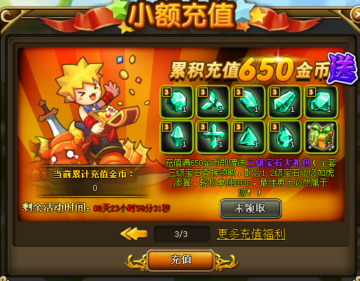 累计充值650金币:三级宝石大礼包(全套三级宝石直接领取,配合1,2级宝石让您如虎添翼,轻松单挑BOSS,最佳勇士必然属于您!