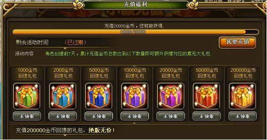 2、 活动期间玩家累积充值达到指定额度即可领取当前额度礼包