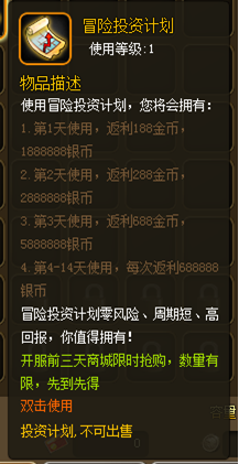 是否对冒险契约里的天使翅膀垂涎欲滴呢?别担心,在新服开启后,只要您充值任意金额,就可以获得价值6888金币的首充礼包一个,天使之羽就在礼包中等着您哦!另外还有直接使用就能升一级的“升级卡”哦!