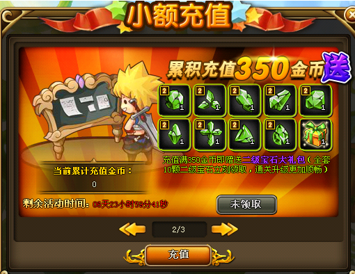 累计充值350金币:二级宝石大礼包(全套10颗二级宝石立刻领取,通关升级更加顺畅)