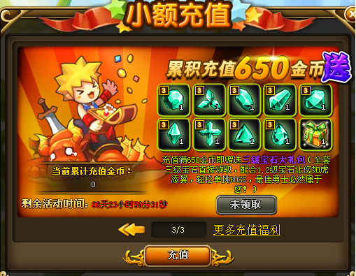 累计充值650金币:三级宝石大礼包(全套三级宝石直接领取,配合1,2级宝石让您如虎添翼,轻松单挑BOSS,最佳勇士必然属于您!