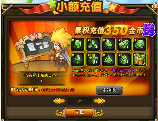 累计充值350金币:二级宝石大礼包(全套10颗二级宝石立刻领取,通关升级更加顺畅)