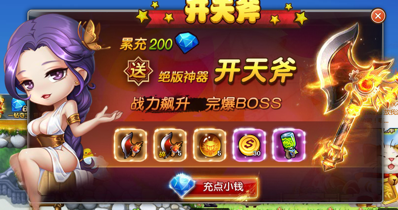活动期间内,充值200钻石,可获得绝版神器“开天斧”!