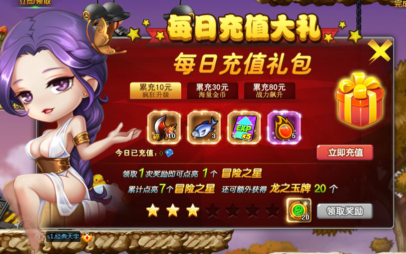 活动期间内,每日累计充值达到一定额度时,即可领取相应的奖励。领取1次奖励即可点亮1个冒险之星,累计点亮7个冒险之星,还可额外获得20个龙之玉牌。