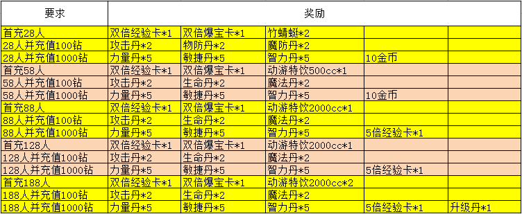 活动期间内,全服首充人数达到一定数量,并且个人充值金额达到相应奖励需求,即可领取相应的奖励。
