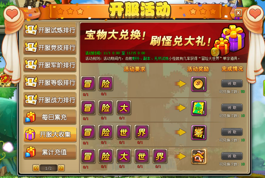 活动期间内,击败野外、副本、无尽试炼小怪就有概率获得“冒险大世界”单字道具,消耗单字道具可兑换各种道具。