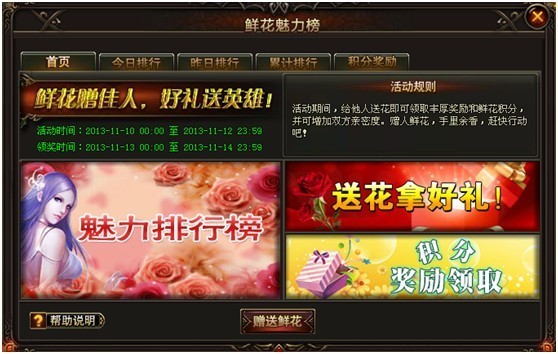 1. 本届鲜花榜将计算11月10~12日3天的送花数量。届时本服累积收到玫瑰数量最多的玩家将获得“魅力之王”称号;