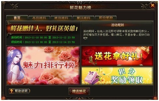 截止11月30日 23:59累积收到玫瑰最多的玩家将成为服务器的“魅力之王”的称号;