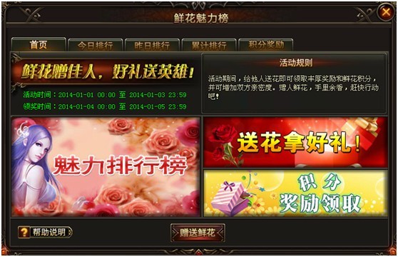 1. 本届鲜花榜将计算1月1~3日3天的送花数量。届时本服累积收到玫瑰数量最多的玩家将获得“魅力之王”称号;