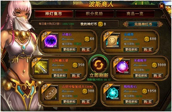 2. 同时玩家可每隔15分钟免费使用一次刷新功能刷新面板上的商品,若刷新功能在CD中,还可以使用神灯币进行快速刷新;