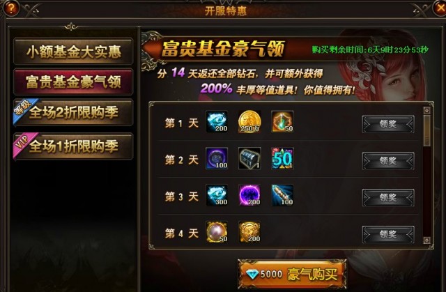 活动期间,玩家可打开“开服特惠”活动面板,根据自己的需要,可以从:小额基金、富贵基金、2折限购、1折限购中用简直无法想象的超低价格,购入海量超值奖励。机会仅此一次,绝对不容错过。