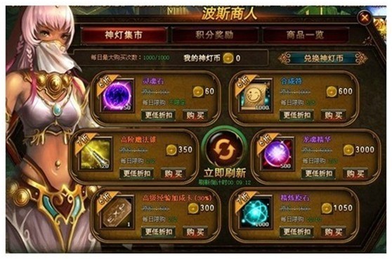 2. 同时玩家可每隔15分钟免费使用一次刷新功能刷新面板上的商品,若刷新功能在CD中,还可以使用神灯币进行快速刷新;