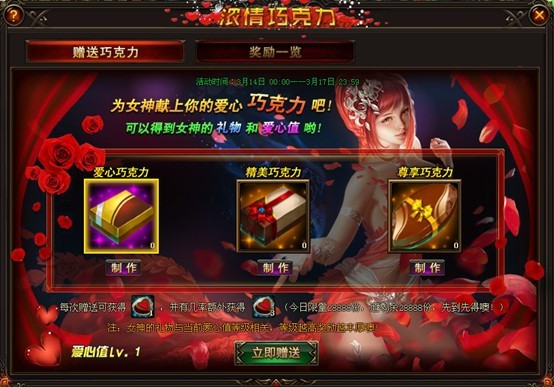 1. 赠送女神1份巧克力可获得女神爱恋回礼1份,每日限量赠送额外的爱恋回礼,先到先得;