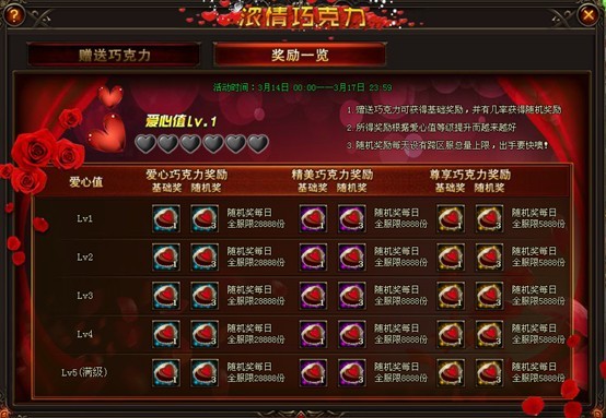 2. 赠送巧克力奖励与当前爱心值等级有关,爱心值等级越高奖励越丰厚。
