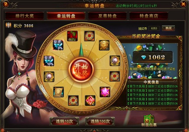 每使用一张抽奖券,除了抽中的奖品外,您还可获得1点转盘积分和增加奖池钻石*1。根据转盘积分可在【积分奖励】中领取相应奖励物品,还可在【积分商店】内兑换众多超值礼品。