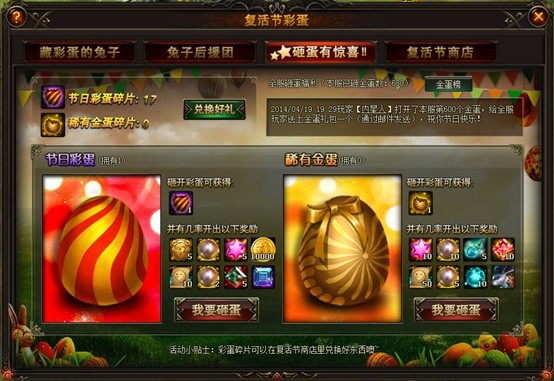 复活节期间,鼎鼎大名的“越狱兔”携三个同伙“兔湿基”“兔八锅”“牛虻兔”在女神大陆上疯狂逃窜,随着他们的一阵胡作非为,女神大陆上散落了许多复活节彩蛋,各位英雄们只需寻找到那些彩蛋即可获得丰厚的奖励,若您足够幸运寻找到金蛋还有机会获得复活节限量版坐骑和时装哦!