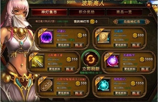 2. 同时玩家可每隔15分钟免费使用一次刷新功能刷新面板上的商品,若刷新功能在CD中,还可以使用神灯币进行快速刷新;