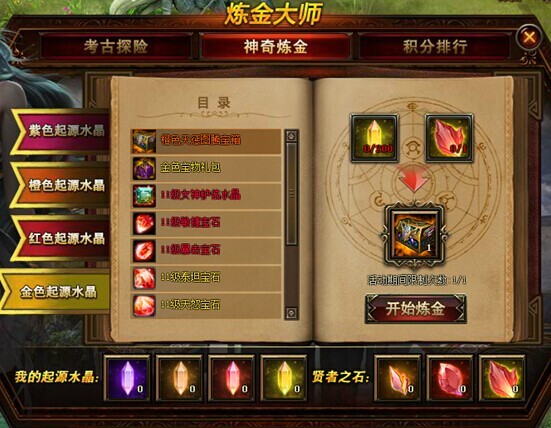 1. 玩家通过考古探险获得了起源水晶和贤者之石后,可以到神奇炼金中兑换奖励。