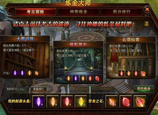 活动期间,玩家可点击主界面左方的【炼金大师】按钮即可进入考古之路开始寻宝咯!炼金大师中的奖励需要您在考古探险中的大图书馆、暗影禁牢和云顶仙宫这三处考古来获得起源水晶和贤者之石并进行神奇炼金获得您想要的奖励。