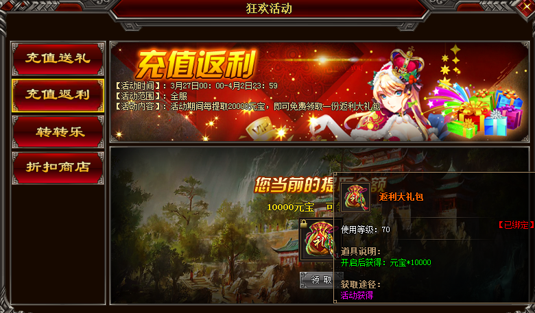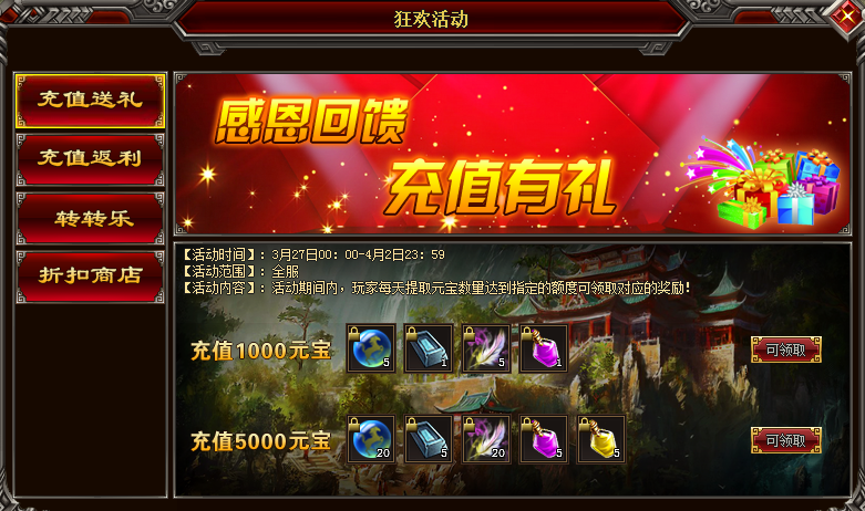 2.活动期间,玩家每天提取5000元宝,即可免费领取 :灵兽元婴魄*20;重铸铁锭*5;女娲灵魄*20;高级暴击药水*5;高级暴击伤害药水*5.