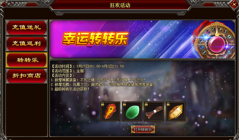 【活动内容】:新增神翼装备不死之精、不死之气、不死之神、不死之元;新增龙鳞、凤凰之羽、御灵碎片,在驯兽师处兑换特殊坐骑和宠物装备