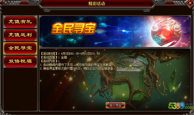 2.神佑寻宝累计次数达388次,必获得70级坐骑装备、天石、地石中的任意一件。