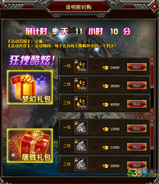 【活动内容】:活动期间,梦幻礼包每天限购其中一个档次,屠戮礼包每天限购其中一个档次,欲购从速!