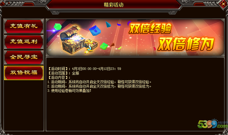 1.活动期间,开启全天双倍经验、双倍修为,刷怪可获得双倍经验和双倍修为;