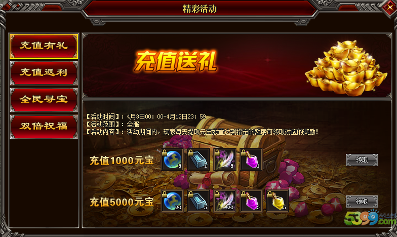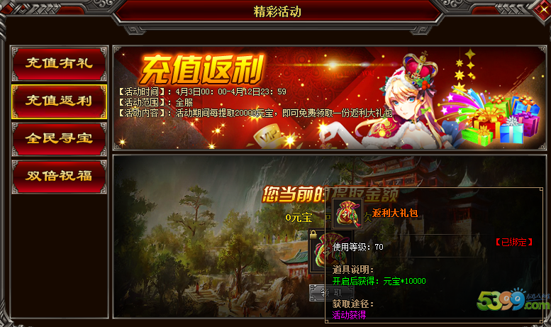 2.活动期间,玩家每天提取5000元宝,即可免费领取 :灵兽元婴魄*20;重铸铁锭*5;女娲灵魄*20;高级暴击药水*5;高级暴击伤害药水*5.