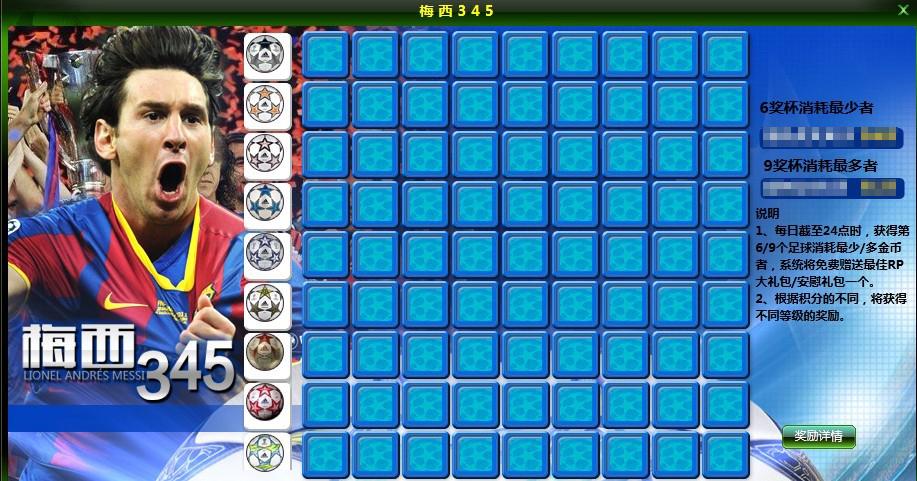 4、在活动期间,每天截止24:00时,获得第6个“足球”消耗最少金币者,系统将免费赠送最佳RP大礼包,礼包内含:1-6级合同各一个,一套5级装备套,战术积分卡5000点。同时,获得第9个“足球”消耗最多金币者,系统将免费赠送安慰礼包,礼包内含:球员经验卡10000点。