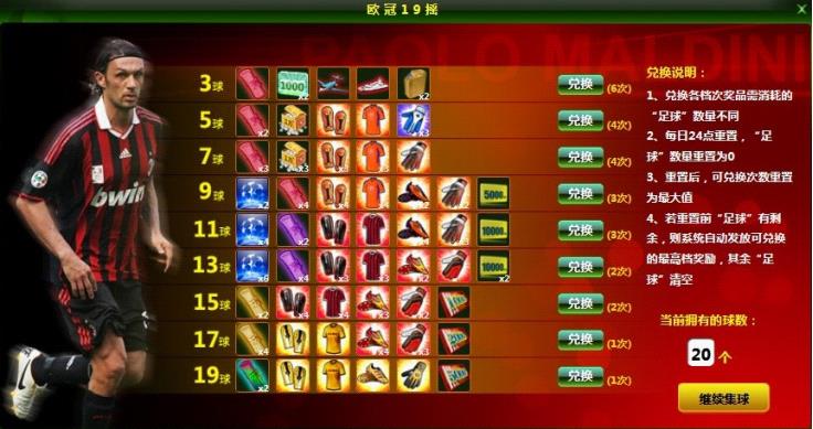 9球奖:欧冠之魂*2,合同5级*4,4级护腿*4,4级战袍*4,4级战靴*2,4级手套*2,战术积分卡5000点。每人每天可兑换3次。