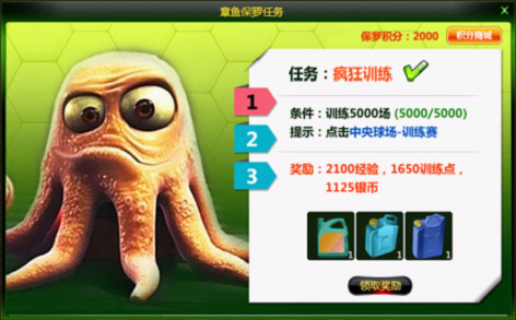 主线任务、支线任务,有点难?每日任务,又太少?小case!章鱼保罗来解决!自2012年11月26日9:00起,球队等级到达41级的玩家,即可开启章鱼保罗任务喽!在这里,不仅可以获得各种道具奖励,还可通过获得的保罗积分来兑换道具,更有机会通过积分兑换直接获得高品质的球员呢!