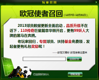 活动详情:活动期间内,仍在欧冠的铁杆玩家,通过点击“好友召回”按钮进入召回界面,只需输入“好友的球队名”,即可进行好友召回!只要您召的好友回归游戏,即成功召回哦!同时根据您成功召回好友的数量,可以领取不同的礼包呢!