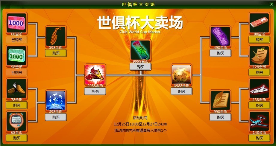 ”进入,15件不可或缺的赛事道具便展现在眼前呢!不仅有欧冠之魂,更有 8级合同,还有参与世俱杯跨服赛押注的新丁——球票呢!……你想要的道具大卖场里都会有哦,尽情淘吧!点此查看世俱杯详情。