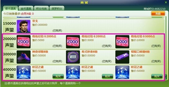“银币商城”内将添加声望达到3000、7000、200000、300000、400000时可用银币兑换的游戏道具,超级实惠送到你手,感动常在呀!声望衔接更为紧密,道具更为诱人,合同、6级教练道具、欧冠之魂等各种有哦!!如此厚礼送眼前,新老球友怎能不心动?继续为球队声望而努力奋斗吧!