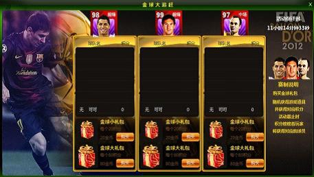 ”按钮进入活动界面。在活动界面内购买礼包,不仅可随机获得合同、教练合同、球员经验卡、教练经验卡、战靴、欧冠之魂等道具材料,购买礼包还可获得积分,活动截止时积分榜状元可获得金球候选大牌哟!不要忘了拥有三位西甲金球候选大牌可以合成巨星金球梅西哦~^_^