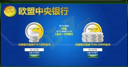 ”入口,即可进入欧盟银行活动界面,利用金币即可兑换银币哦!兑换比例最高可达1金币=120银币哦!活动时间仅此一天,限时、限量,兑换银币的大好机会,一定要把握住哦!