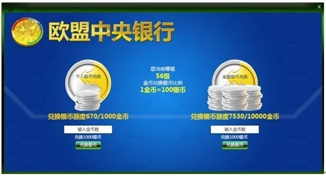 ”即可进入欧盟银行活动界面,利用金币即可兑换银币哦!兑换比例最高可达1金币=120银币哦!活动时间仅此一天,限时限量!