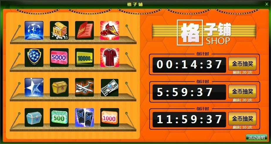 ” 即可开始格子铺抽奖活动。格子铺3档抽奖,倒计时归0时,即可进行格子铺免费抽奖。欧冠之魂、欧冠勋章、5级装备、5级教练合同等超级幸运奖期待你来抽取哦~分秒必争的你,如果不堪忍受等待之苦,也可以立即花一定量的金币进行抽奖哦!每日每人抽奖次数有限,机会难得哦~